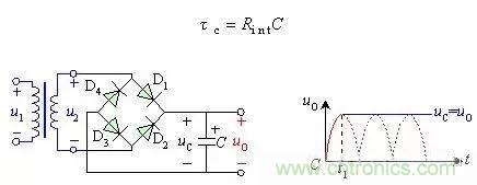 式中包括變壓器副邊繞組的直流電阻和二極管的正向導通電阻。由于一般很小,電容器很快就充到交流電壓u2的最大值,如波形圖2(b)的時刻。此后,u2開始 下降,由于電路輸出端沒接負載,電容器沒有放電回路,所以電容電壓值uC不變,此時,uC>u2,二極管兩端承受反向電壓