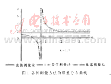 圖1表示取L=1.5時(shí)相對(duì)誤差隨元件值的分布情況??梢钥闯?,比率測(cè)量法在很寬的測(cè)量范圍內(nèi)均具有良好的抗干擾能力。當(dāng)存在多個(gè)影響因素或者在分析由上述方法組合成的測(cè)量裝置時(shí),可根據(jù)疊加原理按系統(tǒng)誤差的理論綜合評(píng)定其精度。