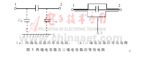 一般情況下,電阻、電感和電容等電子元件均被看作雙端元件。兩端電容器的等效電路示如圖3(a)。由于各端鈕對(duì)附近導(dǎo)電物體的分布電容C1G、C2G是變化的,