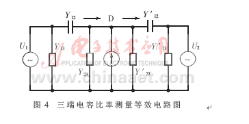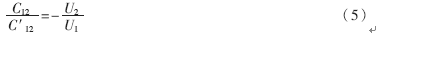 如果將兩個(gè)三端電容串接起來,分別用兩個(gè)信號(hào)源供電,就形成了如圖4所示的等效電路,其中,Y12=jωC12,Y′12=jωC′12。在公共點(diǎn)D與接地端之間連接一個(gè)檢流計(jì),調(diào)節(jié)兩個(gè)外加電壓的幅值和相位,使通過兩個(gè)直接電容流向D點(diǎn)的電流大小相等、方向相反,直道檢流計(jì)指零,便可得到下面的關(guān)系式: