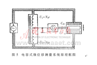 現(xiàn)以設(shè)計(jì)一個(gè)測(cè)量微小位移的系統(tǒng)為例來說明上述測(cè)量方法的應(yīng)用。首先,用高導(dǎo)磁率環(huán)形鐵芯繞制出感應(yīng)耦合比率臂,再設(shè)計(jì)適當(dāng)?shù)目勺冮g距三電極差動(dòng)式電容位移傳感器的結(jié)構(gòu),并采用比率測(cè)量線路,就有如圖5所示的微位移測(cè)量系統(tǒng)原理框圖。對(duì)雙極板電容傳感器,不考慮電場(chǎng)的邊緣效應(yīng),兩個(gè)直接電容為:C12=