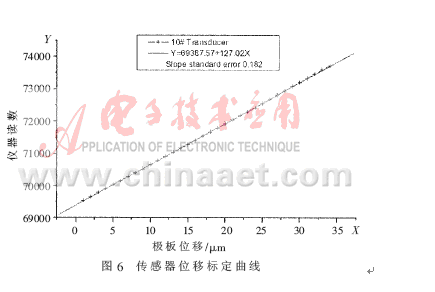從最后獲得的極板位移與比率變壓器讀數(shù)的關(guān)系式(6)可知,讀數(shù)隨中心電極的位移呈線性變化。實(shí)際完成的系統(tǒng)由于結(jié)構(gòu)的不完善性,在接近量程的兩端會(huì)出現(xiàn)一定程度的非線性,如果采取等電位屏蔽等措施,可以把輸出特性的非線性降低到可以忽略的程度??梢?,將差動(dòng)式電容位移傳感器與比率測(cè)量方法結(jié)合起來,設(shè)計(jì)的測(cè)量系統(tǒng)既有很高的分辨能力及較強(qiáng)的抗干擾能力,也能夠獲得很好的線性響應(yīng)。
