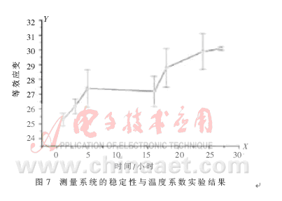 擬合方程顯示在圖中上部的方框里。從實(shí)驗(yàn)結(jié)果可看出,一微米位移可獲得變壓器電橋讀數(shù),變化為127.02,輸出特性的非線性誤差小于0.15%F.S.。比率臂第五檔變化一個(gè)數(shù)對(duì)應(yīng)的位移量根據(jù)傳感器結(jié)構(gòu)的不同,一般在5~8納米之間,末級(jí)的數(shù)據(jù)采集器可獲得300多毫伏的輸出,從數(shù)據(jù)采集器便能夠分辨出0.02納米的變化。在實(shí)驗(yàn)室環(huán)境下,傳感器測(cè)值隨著溫度的變化會(huì)產(chǎn)生極大的漂移,用標(biāo)準(zhǔn)元件來檢查變壓器電橋測(cè)量系統(tǒng)的溫度系數(shù)與穩(wěn)定性,所得結(jié)果見圖7。在28小時(shí)的實(shí)驗(yàn)期間測(cè)值等效變化僅為0.1納米,環(huán)境溫度變化為3~4℃。作者還曾將差動(dòng)電容式位移傳感器放到100米深的鉆井底部,那里溫度的年變化不到0.03℃,整個(gè)位移測(cè)量系統(tǒng)月漂 移率僅為0.1納米[3]。