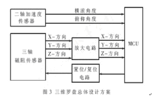 本電子羅盤的設計充分考慮了汽車內(nèi)部的不平穩(wěn)性以及磁場干擾,采用了抗干擾技術,使系統(tǒng)測量精度得到了提高。由于采用了三軸設計和姿態(tài)補償設計方案,使羅盤處于任何姿態(tài)時均能正常使用。此外,本系統(tǒng)經(jīng)過微控制器進行數(shù)字輸出,從而可集成于GPS定位系統(tǒng)之中。