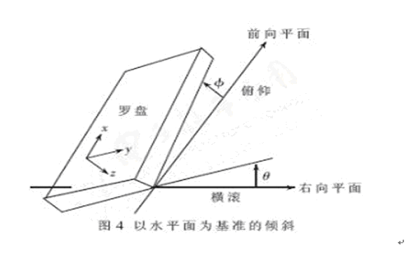 地球磁場的強度為0.6高斯左右,現(xiàn)有的磁阻傳感器可以很好地測量地磁場范圍內(nèi)的磁場強度。由于二維羅盤只能在保持水平的情況下正常工作,如果用于車輛的動態(tài)環(huán)境中,將不可能保證其永遠水平,所以在這種場合下,羅盤的可使用性大大降低。于是需要設計三維羅盤以適應各種姿態(tài)的測量。三維電子羅盤的總體設計方案如圖3所示。三軸磁阻傳感器分別從X、Y、Z 三個磁場強度方向輸出電壓,經(jīng)過放大電路分別輸入到三個具有A/D轉(zhuǎn)換能力的MCU端口,二軸加速度傳感器測量俯仰角度和橫滾角度,測量參數(shù)的意義如圖4所示。