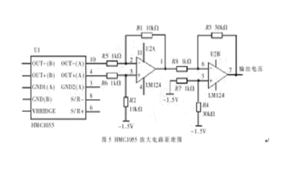 經(jīng)過上面的分析,使用雙運算放大器來設計基本電路,將需要的電壓信號放大以進行A/D轉(zhuǎn)換。圖5給出了一個HMC1052放大電路的典型方案。由于Vout=±4.875mV,ADC采樣在0~3V或者1.5±1.5V范圍內(nèi),這樣就允許運算放大器調(diào)整其增益,以將±4.875mV的信號放大至±2.5V的ADC范圍內(nèi)。因此,運算放大器的增益為: