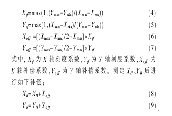 因為硬鐵影響是恒定的,所以可以采用標定的方法消除干擾。標定的方法為:將車載羅盤在水平面旋轉(zhuǎn)一周,記錄下X、Y兩個方向的最大和最小值(Xmax、Ymax)、(Xmin、Ymin),代入式(4)、(5)、(6)、(7)中,可以得到Xo f f 、Yo f f 。