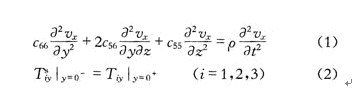 與淺體聲波一樣,表面橫波也是SH型聲表面波,只有平行于晶體表面單一的質(zhì)點(diǎn)振動(dòng)方向。因此可以假定表面橫波在晶體表面沿著Z方向傳播,質(zhì)點(diǎn)在X方向振動(dòng)。克里斯托夫方程及晶體表面的邊界條件可表示為