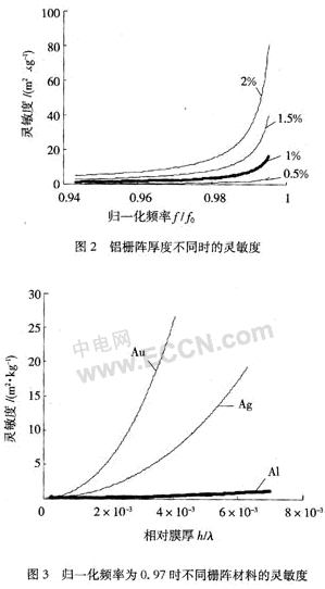 綜上分析,對(duì)于STW傳感器,柵陣厚度的增加有利于靈敏度的提高,柵陣厚度越大,靈敏度越高。但是在同一工作頻率下柵陣厚度的增加同時(shí)引起損耗的變化,在實(shí)際器件設(shè)計(jì)時(shí),應(yīng)當(dāng)同時(shí)考慮這兩個(gè)因素,選擇一個(gè)最佳厚度。在柵陣厚度值確定時(shí),IDT的激發(fā)頻率接近阻帶邊緣頻率時(shí)能獲得較大的靈敏度。對(duì)于柵陣材料的選擇,由以上的分析可知,金獲得靈敏度最大,大于銀的2倍,遠(yuǎn)遠(yuǎn)高于鋁。