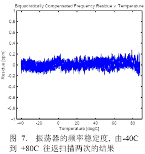 圖7為補償后的頻率穩(wěn)定性數(shù)據(jù), 溫度從-40℃到+85℃范圍內掃描兩次并返回到-40℃。整個溫度范圍的總頻率誤差小于100ppm (200ppm測量噪底,30ppm測量誤差),遲滯大約小于50ppm。