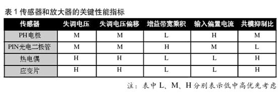 選擇放大器與傳感器正確接口時,設計人員必須使放大器與傳感器特性匹配??煽康姆糯笃魈匦詫τ趥鞲衅?mdash;—放大器組合的工作是關鍵性的。傳感器和放大器的關鍵性能指標見表1。例如,PH電極是一個高阻抗傳感器,所以,放大器的輸入偏置電流是優(yōu)先考慮的(表中的H)。PH傳感器所提供的信號不允許產生任何相當大的電流,所以,放大器必須是在工作時不需要高輸入偏置電流的型號。具有低輸入偏置電流的高阻抗MOS輸入放大器是符合這種要求的最好選擇。另外,對于應用增益帶寬乘積(GBP)是低優(yōu)先考慮(表1中L),這是因為傳感器工作在低頻,而放大器的頻率響應不應該妨礙傳感器信號波形的真正再生。