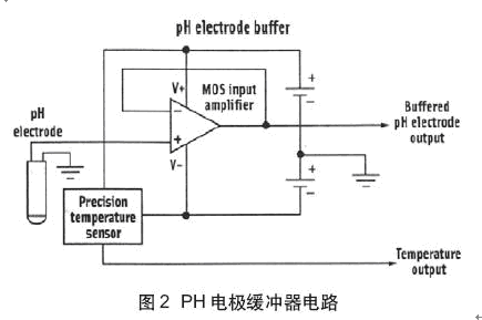 高阻抗PH傳感器可與具有低功率電路(僅需要2個1.5V電池供電)的放大器配對(圖2)。放大器MOS輸入晶體管為傳感器提供高阻抗,傳感器輸出阻抗為1MW或更大。此放大器的輸入偏置電流小于1pA,所以,放大器工作消耗非常小的電流。放大器的失調電壓小于1mV。放大器提供軌到軌工作并具有高驅動能力,能在長線上發(fā)送信號(放大器遠離ADC的情況)。在電路中增加了一個精密溫度傳感器,可以測量PH傳感器的溫度。這使得具有精確的PH溫度補償值。