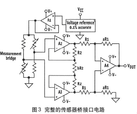 測量應變片傳感器通常要通過橋網絡,應變片構成橋的兩個(或4個)臂。應變片是低源阻抗器件,其輸出信號范圍是小的(幾百微伏~幾毫伏)。圖3所示的電路能為精確測量傳感器信號提供測量橋穩(wěn)定激勵電壓和高共模電壓抑制(CMR),消除了任何共模電壓。用高精度和非常低漂移(隨溫度)的精密電壓基準驅動放大器A1。這可為橋提供非常精確、穩(wěn)定的激勵源。因為共模電壓大約為激勵電壓的一半,所以被測信號僅僅是橋臂之間小的差分電壓。放大器A2、A3、A4必須提供高共模抑制比(CMRR),所以僅測量差分電壓。這些放大器也必須具有低值輸入失調電壓(VOS)漂移(也稱之為失調電壓溫度系數(shù)TCVOS)和輸入偏置電流,以使得從傳感器能精確地讀數(shù)。放大器A1~A4連接成儀表放大器以達到上述目標。這種配置的電壓增益(AV)為:AV=(1+2R2/bR2)(aR1/R1),其中a和b是確定總增益的比值。