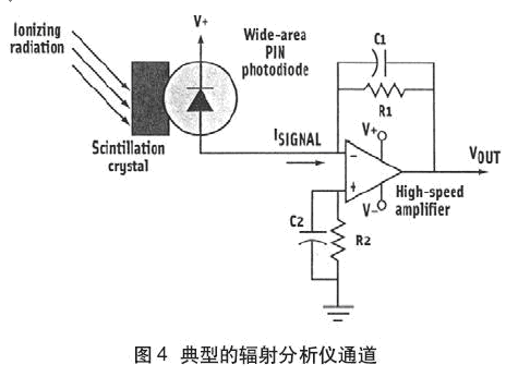 輻射譜測量來自輻射源的發(fā)射能量的分布,輻射源可以是粒子,X射線或γ射線。輻射照到閃光晶體上并發(fā)射強度正比于能量的短脈沖。然后由PIN光電二極管把光轉換為電流。放大器(見圖4)用做首置放大器和PIN光電二極管輸出的電流/電壓轉換器。此電路為用于基本輻射譜的單通道分析儀。信號的脈沖幅度包含重要信息,所以低輸入失調電壓和低失調電壓漂移是重要的。寬帶寬為處理脈沖(可窄到幾納秒)提供快速響應。首置放大器輸出(VOUT)到脈沖幅度分析儀(如快速ADC)來測量和儲存每個峰值發(fā)生的數(shù)。分布是單個源的光譜。反饋電阻R1值取決于來自PIN光電二極管的最大電流和到ADC的最大輸出電壓。因此,R1=(Max VOUT)/(Max ISIGNAL)。電容C1用于PIN光電二極管寄生電容的補償。R2和C2相當于R1和C1用于補償放大器非倒相輸入的輸入偏置電流。