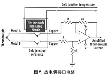 熱電偶根據(jù)兩個不同金屬線結點之間的溫度差提供電壓信號。熱電偶溫度傳感器具有一個感測端(金屬A/金屬B連接端)和一個參考端(金屬A和金屬B與銅導線連接端)。冷端參考溫度與熱電偶信號一道進行控制和測量。熱電偶具有大約10mV/℃~80mV/℃的小信號電平范圍和小的源阻抗。配置成差分放大器的單放大器(圖5)把信號放大到ADC輸入所需的電平。差分放大器增益為:
