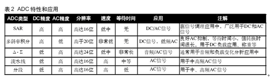 大多數(shù)信號調理應用采用逐次逼近(SAR)或積分型ADC。這兩種ADC能很好地處理dc信號,而SAR型ADC對快速ac信號能提供更好的支持(表2)。SAR轉換器是所有ADC中最通用的,這種轉換器把高分辨率(高達16位)和高吞吐能力結合在一起。