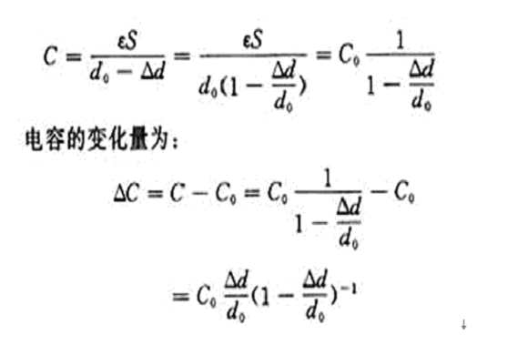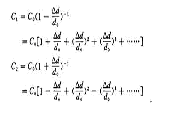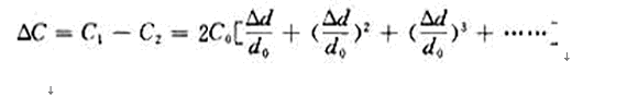 當(dāng)電容器的活動(dòng)極板1移動(dòng)極小時(shí),即Δd<<d0時(shí),上式按泰勒級(jí)數(shù)展開(kāi)為: