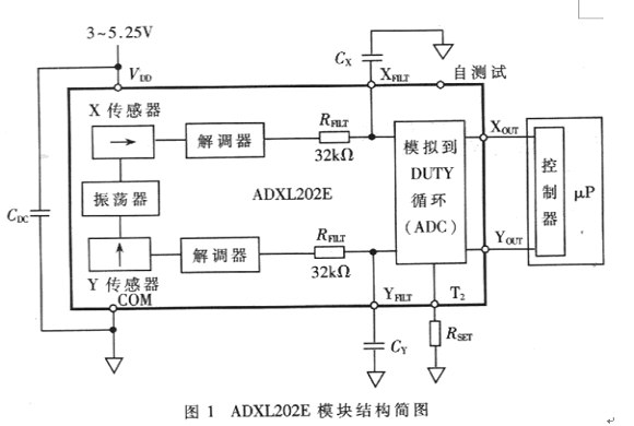 ADXL202的模塊結(jié)構(gòu)如圖l所示,它是在單一芯片上集成兩個(gè)相互獨(dú)立、測(cè)量方向相互垂直的敏感元的測(cè)量模塊,是由多晶硅微加工表面工藝制成的電容式加速度傳感器;由硅片表面的彈性結(jié)構(gòu)支撐起的質(zhì)量塊下面貼附電容的一個(gè)極板,電容的另一極扳固定。當(dāng)加速度引起質(zhì)量塊的相對(duì)位置變化時(shí),電容值也發(fā)生變化;兩個(gè)敏感元的信號(hào)處理電路將各自的電容變化轉(zhuǎn)換成幅值與加速度成正比的方波信號(hào),經(jīng)工作周期調(diào)制(DCM)后,就能將模擬信號(hào)轉(zhuǎn)換為數(shù)字信號(hào),通過(guò)引腳XOUTYOUT進(jìn)行輸出。另外,ADXL202還可以通過(guò)XFILT、YFILT引腳輸出模擬信號(hào)。