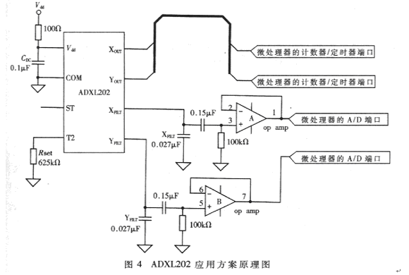 汽車防盜中,車體傾斜角度的測(cè)量要求其信號(hào)的噪聲必須很小,這就要限制信號(hào)帶寬。而對(duì)于振動(dòng)的測(cè)量,則需要10~200Hz的較寬信號(hào)范圍。首先,將XFILY、YFILT引腳的濾波電容CX、CY設(shè)定為0.027μF,這樣輸出的數(shù)字、模擬信號(hào)的帶寬全都限制在200Hz以下,再將ADXl202輸出的帶寬為200Hz的數(shù)字和模擬信號(hào)分別經(jīng)過(guò)低通濾波和高通濾波,就可以獲得傾斜、振動(dòng)監(jiān)測(cè)所需帶寬的信號(hào)。將ADXL202同時(shí)作為振動(dòng)測(cè)量和傾角測(cè)量傳感器的方案原理圖如圖4所示。