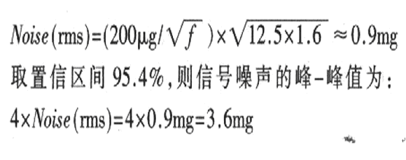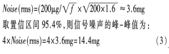 傾斜角度測(cè)量值通過(guò)XOUT、YOUT端口輸出的數(shù)字信號(hào)得到。由于經(jīng)XFILT、YFILT端口的電容低通濾波,信號(hào)帶寬為200Hz.則根據(jù)ADXl202的噪聲計(jì)算公式為:
