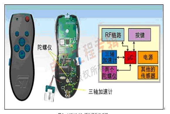 MEMS加速計(jì)與陀螺儀配合使用,可以把更先進(jìn)的選擇功能變?yōu)楝F(xiàn)實(shí),例如:能夠在空中操作的三維鼠標(biāo)和遙控器。在這些設(shè)備中,傳感器檢測(cè)到用戶的手勢(shì),將其轉(zhuǎn)換成PC屏幕上的光標(biāo)移動(dòng)或機(jī)頂盒和電視機(jī)的頻道和功能選擇。圖5是一個(gè)含有MEMS傳感器的遙控器解決方案,MEMS傳感器組、兩個(gè)陀螺儀和一個(gè)加速計(jì)檢測(cè)手腕或鼠標(biāo)在空中的動(dòng)作,同時(shí)微控制器執(zhí)行動(dòng)作跟蹤和手勢(shì)識(shí)別功能。然后,重組的運(yùn)動(dòng)曲線通過(guò)無(wú)線連接發(fā)送到機(jī)頂盒或PC機(jī),無(wú)線鏈路可以采用紅外或射頻,具體視應(yīng)用要求而定。