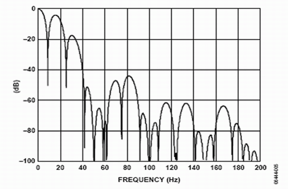 Σ-Δ模數(shù)轉(zhuǎn)換器的內(nèi)置數(shù)字濾波器對(duì)于抑制帶外量化噪聲以及其他噪聲源非常有效。噪聲源之一是電力網(wǎng)供電系統(tǒng)產(chǎn)生的頻率。當(dāng)電力網(wǎng)為器件供電時(shí),將產(chǎn)生50 Hz及其倍頻的供電系統(tǒng)頻率(在歐洲),或產(chǎn)生60 Hz及其倍頻的供電系統(tǒng)頻率(在美國(guó))。窄帶模數(shù)轉(zhuǎn)換器主要采用sinc濾波器。AD7793有4個(gè)濾波器選項(xiàng),模數(shù)轉(zhuǎn)換器可以根據(jù)更新速率自動(dòng)選擇需要使用的濾波器種類。在16.6 Hz的更新速率使用sinc3濾波器。如圖5所示,sinc3濾波器在頻譜內(nèi)存在凹槽。當(dāng)輸出字速率為16.6 Hz時(shí),可以利用這些凹槽同時(shí)抑制50 Hz或60 Hz的頻率。