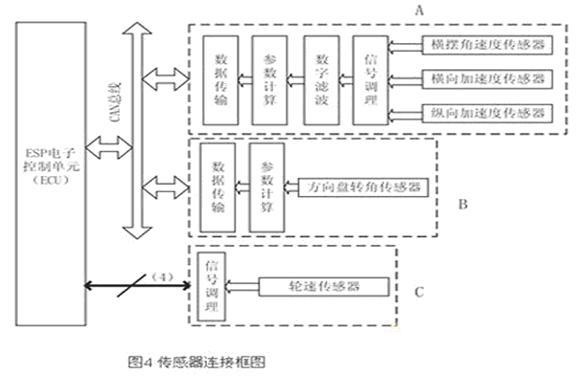 本文所作設(shè)計(jì)的框圖如圖4所示。在圖中,方向盤轉(zhuǎn)角傳感器信號經(jīng)微控制器處理后,通過CAN總線發(fā)送給ECU(圖4中B);橫擺角速度傳感器、縱向/橫向傳感器由于信號特點(diǎn)和安裝位置類似,故設(shè)計(jì)在同一個(gè)模塊內(nèi)(圖4中A);由于ESP對輪速傳感器信號的實(shí)時(shí)性要求較高,故經(jīng)過信號調(diào)理后,直接送入ECU(圖4中C)。在圖4的A和B中,需要微處理器對信