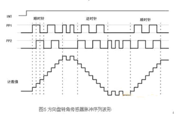 方向盤轉(zhuǎn)角傳感器的輸出為正交編碼脈沖。正交編碼脈沖包含兩個(gè)脈沖序列,有變化的頻率和四分之一周期(90°)的固定相位偏移,如圖5所示。通過檢測2路信號的相位關(guān)系可以判斷為順時(shí)針方向和逆時(shí)針方向,并據(jù)此對信號進(jìn)行加/減計(jì)數(shù),從而得到當(dāng)前的計(jì)數(shù)累計(jì)值,也即方向盤的絕對轉(zhuǎn)角,而轉(zhuǎn)角的變化率即角速度,則可通過信號頻率測出。另外,方向盤轉(zhuǎn)角傳感器有一個(gè)零位輸出信號,當(dāng)方向盤在中間位置時(shí),該信號輸出0V,否則輸出5V,通過該信號,可對絕對轉(zhuǎn)角進(jìn)行在線校準(zhǔn)。