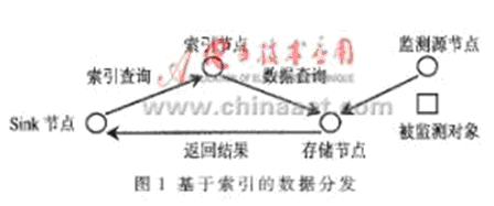 (4)基于索引的數(shù)據(jù)分發(fā)方案(index-based data dissemination scheme)[3],這種方案克服了以上幾種方案存在的問題。在這種方案中,負責監(jiān)測某對象的源節(jié)點定期產生該監(jiān)測對象的感知數(shù)據(jù),并存儲到存儲節(jié)點上,存儲節(jié)點可能是該源節(jié)點,也可能是鄰近的某個節(jié)點。同時,存儲節(jié)點的位置信息(稱為索引),要增加到索引節(jié)點上。當sink節(jié)點想查詢某個被監(jiān)測對象產生的感知數(shù)據(jù)時,就發(fā)送一條查詢消息給有關的索引節(jié)點,索引節(jié)點收到該消息后轉發(fā)查詢請求給相應的存儲節(jié)點,由存儲節(jié)點直接發(fā)送查詢結果給sink節(jié)點。其基本思想如圖1所示。這種數(shù)據(jù)分發(fā)方案避免了發(fā)送不需要的感知數(shù)據(jù),也不需要把控制信息泛洪到整個網絡,改善了整個系統(tǒng)的性能,但是增加了維護索引節(jié)點的額外費用。