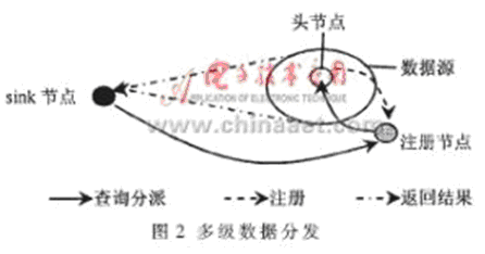 (5)多級數(shù)據(jù)分發(fā)方案(multi-resolution data dissemination scheme)[4],綜合了LS和DCS數(shù)據(jù)分發(fā)方案的技術。其基本思想是在數(shù)據(jù)源中選擇一個頭節(jié)點,代表源節(jié)點在最近的注冊節(jié)點上進行注冊。sink節(jié)點把查詢發(fā)送到所有注冊節(jié)點上,從注冊節(jié)點再把查詢發(fā)送到所有匹配的頭節(jié)點,當頭節(jié)點收到查詢后,在數(shù)據(jù)源內選擇一組節(jié)點進行查詢。由于sink節(jié)點的位置包含在它分派的查詢中,查詢節(jié)點可以直接把感知數(shù)據(jù)發(fā)送給sink節(jié)點,其基本思想如圖2所示。這種數(shù)據(jù)分發(fā)方案避免了查詢泛洪,能有效減少能量消耗。但是在數(shù)據(jù)源中只是基于感知范圍參數(shù)來選擇查詢節(jié)點,沒有考慮數(shù)據(jù)的分布情況。
