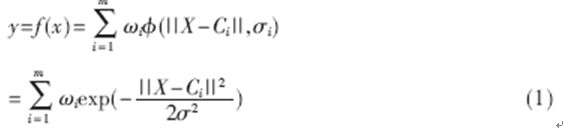 RBF神經(jīng)網(wǎng)絡(luò)即徑向基函數(shù)(Radial Basis Function)神經(jīng)網(wǎng)絡(luò)[3~4],其結(jié)構(gòu)如圖3所示。它很容易擴(kuò)展到多輸出節(jié)點(diǎn)的情形,在此只考慮一個(gè)輸出變量Y的情況。RBFNN包括一個(gè)輸入層、一個(gè)隱含層和一個(gè)輸出層的最簡模式。隱含層由一組徑向基函數(shù)構(gòu)成,與每個(gè)隱含層節(jié)點(diǎn)相關(guān)的參數(shù)向量為Ci(即中心)和σi(即寬度)。徑向基函數(shù)有多種形式,一般取高斯函數(shù)[5]。具體如下:
