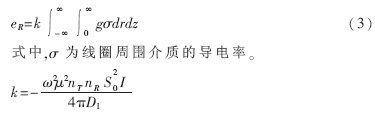在發(fā)射頻率不高、介質(zhì)導(dǎo)電率較小的條件下,可忽略電磁波傳播效應(yīng)和渦流損耗,用幾何因子理論對(duì)接收線圈中的二次感應(yīng)電動(dòng)勢(shì)進(jìn)行計(jì)算,將同軸于z的兩線圈周圍介質(zhì)中的感應(yīng)渦流分割成以探頭軸心為圓心、半徑為r、距線圈T和R距離分別為ρT和ρR的小單元環(huán)電流。將探頭周圍介質(zhì)看作是均勻無限介質(zhì),把所有的單元環(huán)感生的電動(dòng)勢(shì)疊加在一起得到: