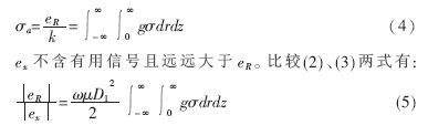 式中,ω為發(fā)射電流的頻率。由式(2)可以看出,ex是一個(gè)落后于發(fā)射電流π/2且與探頭周圍介質(zhì)導(dǎo)電率無關(guān)的電勢(shì)信號(hào)。在系統(tǒng)的接收信號(hào)中,它表現(xiàn)為一個(gè)幅值較大的背景噪音。