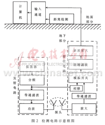整個(gè)系統(tǒng)分為地上和地下兩部分,其基本組成結(jié)構(gòu)如圖2所示。兩大部分之間通過電纜相連接。地下部分中包括裝有線圈的探頭以及分別屏蔽在兩個(gè)金屬盒中的發(fā)射電路和接收電路。地下部分的所有裝置全部固定安裝在一節(jié)經(jīng)過防水處理的直徑為8cm左右的聚氯乙稀管內(nèi)。為了防止對(duì)探頭檢測過程的干擾,設(shè)計(jì)時(shí)應(yīng)該充分考慮地下部分的電路及導(dǎo)線的固定和屏蔽問題。
