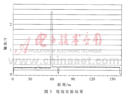 現(xiàn)場實(shí)驗(yàn)的結(jié)果如圖3所示。圖中曲線起始端和結(jié)束端的兩處低電平為兩已知檢查孔A和C。63m處的低電平則是需要被定位的檢查孔B的具體位置。另外,兩處的高電平表明該處有某種較高導(dǎo)電率的介質(zhì)存在。后來發(fā)現(xiàn):在36m處有一段多年前因管道維修所更換的PVC管道,而52.5m處則是另一段因同樣原因所更換的鋼管。