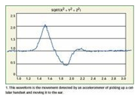 圖1:圖中波形是檢測(cè)拿起手機(jī)并送到耳邊這個(gè)動(dòng)作的加速計(jì)所測(cè)到的姿態(tài)運(yùn)動(dòng)。
