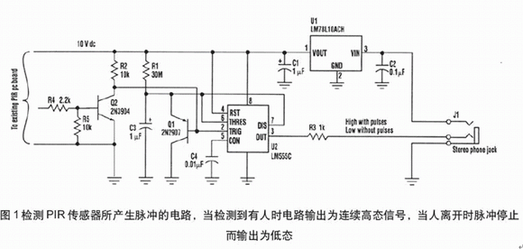 通常,當(dāng)所檢測區(qū)域無人時,無脈沖被檢測,而輸出為低態(tài)。當(dāng)檢測到脈沖時,輸出變高態(tài)。電源(12~14Vdc)通過立體聲電話插口(與輸出信號一道)供電,然后穩(wěn)壓到+10V。此電路放置在PIR傳感器內(nèi),電話插口放在機盒的下部。電阻器R4連接PIR LED驅(qū)動器。地和+10V連接到PIR中的適當(dāng)位置。