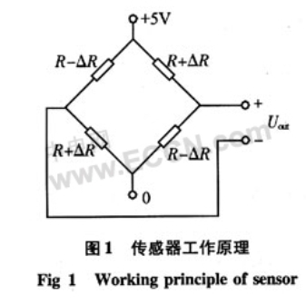 整個傳感器最關鍵的部分是其中的惠斯通電橋。當外加磁場后,電橋的電阻變化,如圖1所示,引起傳感器輸出電壓Uout變化Uout=(△R/R)Ub,式中 Ub為傳感器工作電壓。