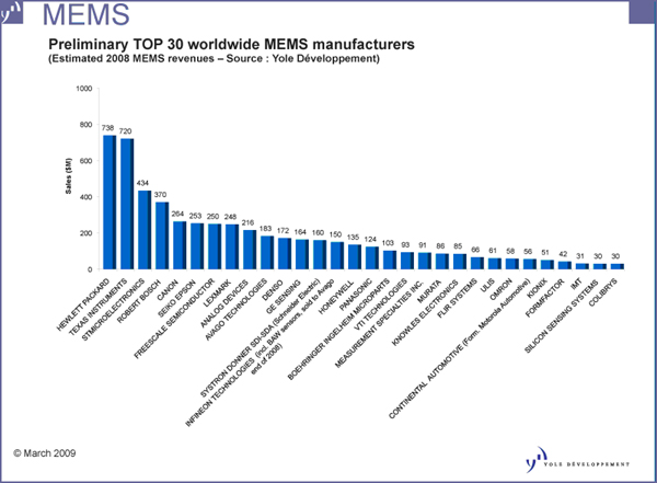 - 市場研究公司Yole Developpement近日發(fā)布2008年MEMS廠商排名