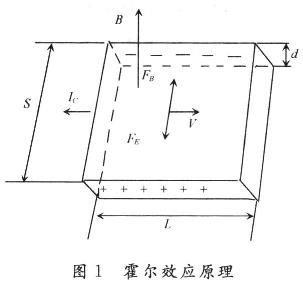 如圖1所示,一個(gè)N型半導(dǎo)體薄片,長度為L,寬度為S,厚度為d,在垂直于該半導(dǎo)體薄片平面的方向上,施加磁感應(yīng)強(qiáng)度為B的磁場,若在長度方向通以電流Ic則運(yùn)動(dòng)電荷受到洛倫茲力的作用,正負(fù)電荷將分別沿垂直于磁場和電流的方向向?qū)w兩端移動(dòng),并聚集在導(dǎo)體兩端形成一個(gè)穩(wěn)定的電動(dòng)勢UH,這就是霍爾電動(dòng)勢(或稱之為霍爾電壓),這種現(xiàn)象稱為霍爾效應(yīng)。霍爾電壓的大小UH=RIB/d=KHICB,其中R為霍爾常數(shù);KH為霍爾元件的乘積靈敏度。