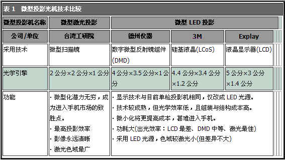 由于便攜式裝置內(nèi)建微型投影機風(fēng)潮興起,市場對于微型投影機的尺寸要求更加嚴苛。有業(yè)內(nèi)人士表示,相比發(fā)光二極管(LED)光源微型投影技術(shù)(表1),激光微型投影具有無限焦距、光機體積小、色彩飽和度高、低耗能等特性,后勢深具潛力。