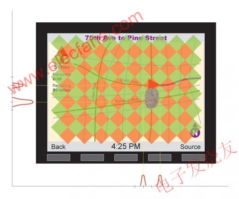 通過比較當前基于電阻式觸摸屏和帶手勢識別的電容式觸摸屏的汽車HMI概念,我們可以發(fā)現(xiàn),新增手勢識別功能后,駕駛?cè)藛T對路面的關(guān)注程度在某些方面有所改善。通過電容式觸摸屏的手勢識別不僅是一種新的輸入方式,更使系統(tǒng)輸入提升到了一個新的層次。采用電容式觸摸屏,駕駛?cè)藛T仍然可以通過點擊瀏覽菜單結(jié)構(gòu),滑動手指提高音量或者調(diào)節(jié)HVAC風扇速度。不過,真正重要的是其控制標準功能的簡易度,比如控制駕駛過程中非常必要的導(dǎo)航功能。用戶不必緊盯著屏幕,只需一個簡單的手勢即可實現(xiàn)縮小操作。屏幕上的任何區(qū)域都可以感知手勢,因此駕駛?cè)藛T不必把手指放在特定的位置來完成操作。圖1顯示就是這種導(dǎo)航屏幕上的動作感知說明。