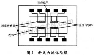 圖1是由清華大學(xué)設(shè)計(jì)、中國電子集團(tuán)第13研究所加工而成的微流體陀螺儀。它是利用氣體流速方向在哥氏加速度作用下發(fā)生偏轉(zhuǎn)的原理,采用微機(jī)械加工工藝制作的。此微流體傳感器由隔熱腔體、加熱器和兩對對稱的溫度傳感器構(gòu)成。加熱器和溫度傳感器懸在腔體上面。加熱器加熱使其周圍的氣體溫度升高,密度減小。在重力加速度的作用下,腔體內(nèi)的氣體發(fā)生對流。位于加熱器相等距離上的一對溫度傳感器用來測量加熱器兩邊的溫差。