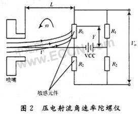 射流氣體陀螺是利用強(qiáng)迫對流氣體的氣流束(層流)和敏感元件的熱阻效應(yīng)來測量角速率的。目前,采用MEMS技術(shù)制作的射流微陀螺并不多。報(bào)道的射流氣體微陀螺主要由壓電驅(qū)動泵、循環(huán)氣流通道及腔室、微噴嘴和熱敏元件等組成。它結(jié)構(gòu)簡單,無活動檢測質(zhì)量,抗過載能力強(qiáng),成本低,壽命長。它是在哥氏力定理基礎(chǔ)上發(fā)明出來的,它通過壓電泵驅(qū)動氣體循環(huán),當(dāng)陀螺有角速度信號輸入時(shí),利用哥氏力使循環(huán)氣流束偏轉(zhuǎn)來實(shí)現(xiàn)角參數(shù)的測量。循環(huán)氣流是由壓電泵激勵(lì)而產(chǎn)生的氣體層流束(射流),信號由兩根平行的熱敏絲R1,R2敏感。當(dāng)輸入角速度為∞時(shí),由于哥氏力的作用,射流束偏離原來所在的射腔的中心位置(見圖2),偏離的角度和方向決定于輸入角速度,這樣通過測量外圍電路電壓的變化便可測量出相應(yīng)的加速度值。
