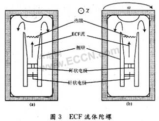 流體是一種新型的流體材料,當(dāng)在流體兩端的電極上加上幾千伏的電壓時(shí),ECF流體可以產(chǎn)生很強(qiáng)的流動,利用ECF流體的這種特性可以制作基于ECF的流體陀螺。由日本東京工業(yè)大學(xué)制作的這種流體陀螺如圖3所示,其基本原理如下:在容器內(nèi)部充滿ECF液體,當(dāng)在如圖3所示的電極上加上上千伏的電壓時(shí),便會產(chǎn)生很強(qiáng)的ECF液體沖擊流,并往圖3(a)所示方向流動。