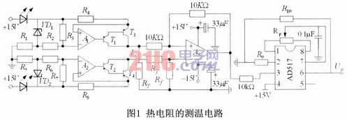 熱電阻的測溫電路如圖1所示,該電路由毫安級恒流源產(chǎn)生電路、差分運算電路和AD517芯片組成。該電路采用兩個完全相同的毫安級恒流源分別給熱電阻RT和標準參考電阻Rf供電。在恒流源電路中,VD1和VD2為帶溫度補償?shù)姆€(wěn)壓二極管,四個PNP型的三極管T1、T2、T3和T4組成了兩個PNP型復合管,其目的是為了提高放大器的增益,減小誤差,以便提高恒流源的穩(wěn)定度。恒流源與RT和Rf(Rf取為Rf=100Ω)與地組成的電路產(chǎn)生的電壓作為差分運算電路的輸入信號,根據(jù)電路的組成,可以得到差分運算電路的輸出電壓是與熱電阻的阻值成正比的,通過選擇合適的元器件參數(shù)把該裝置的測溫范圍設置為0~120℃。