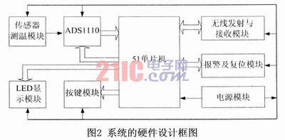 此基于EL-700鉑熱電阻傳感器的高精度測溫裝置既可以單機工作,又可以通過無線收發(fā)模塊實現(xiàn)與計算機之間的無線數(shù)據(jù)傳輸,把采集到的溫度信號送到計算機中進行分析、處理及打印,從而實現(xiàn)數(shù)據(jù)的遠距離傳輸與處理。測溫裝置主要由溫度信號的檢測與采集電路、LED顯示、按鍵控制、電源、報警及復位、無線發(fā)射與接收等功能模塊組成,每一個電路模塊完成一定的功能,測溫裝置的硬件總體組成框圖如圖2所示。