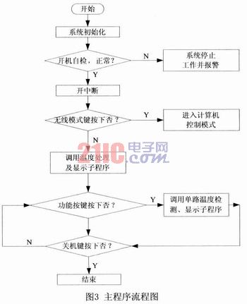 系統(tǒng)上電后單片機首先進行系統(tǒng)初始化,之后程序執(zhí)行相應的自檢子程序,檢測測溫系統(tǒng)是否有故障。系統(tǒng)默認進入的單機工作模式,在單機工作模式下,可以根據(jù)功能按鍵選擇不同的功能,通過系統(tǒng)調(diào)用相應的功能按鍵處理子程序來完成應的功能,并在LED數(shù)碼管上顯示相應的溫度信息,具有非常好的人性化特點;在無線工作模式下,此時系統(tǒng)作為一個下位機,可以和遠程計算機進行無線通信,實現(xiàn)數(shù)據(jù)的遠距離傳輸,利用計算機強大的信息處理功能,把下位機傳送過來的數(shù)據(jù)進行分析和處理。