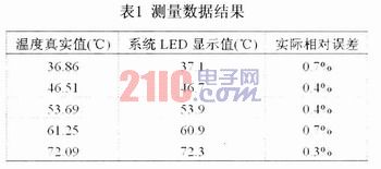 試驗數(shù)據(jù)通過對普通熱水器加熱中的水溫進行測量取得,測量中采用實驗用高精密數(shù)字測溫儀的示值溫度作為被測物體溫度檢測點的溫度真實值,本測溫裝置測得的溫度信息經(jīng)過電路的轉(zhuǎn)換及單片機的處理后,測得的溫度信息在LED數(shù)碼管上的顯示值如表l所示。從表中的數(shù)據(jù)可以看出,本系統(tǒng)LED顯示值和真實值很接近;試驗過程中,由于測量環(huán)境及其它因素的影響,使得系統(tǒng)的測量值在真實值上下波動,但溫度的實際相對誤差始終保持在1%以內(nèi),從而證明了本測溫裝置完全能夠滿足實際的測量要求。