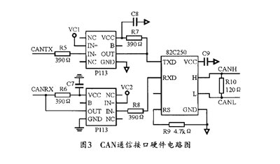 CAN通訊網(wǎng)絡(luò)模塊負(fù)責(zé)將啟動(dòng)信號(hào)和檢測信號(hào)通過CAN網(wǎng)傳輸給汽車的中央處理器。中央處理器通過接收的信號(hào)做決策判斷。CAN總線通信方式靈活、抗干擾能力強(qiáng),目前在汽車控制系統(tǒng)中應(yīng)用廣泛。CAN通訊接口硬件設(shè)計(jì)如圖3所示,其中82C250是CAN控制器和物理總線間的接口,它和CAN控制器之間采用光隔P113來提高系統(tǒng)的抗干擾能力。
